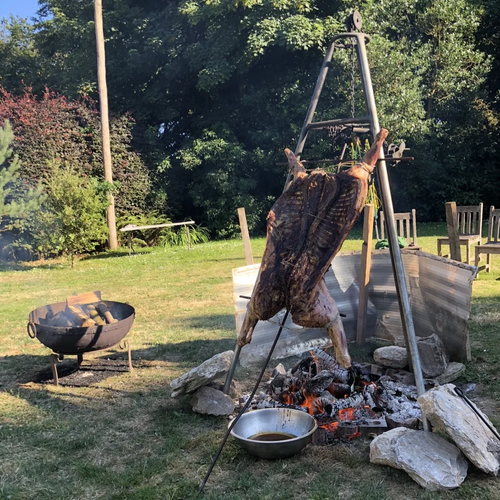We also set up a separate fire pit that we keep going also ... to feed the main fire ... we were pretty much adding wood to the both every 20 - 25 minutes ... a labour of love! We judged the temperature by hand ... literally ... if we could keep our hand in front of the lamb for more than 15 seconds then it wasn't hot enough ...
